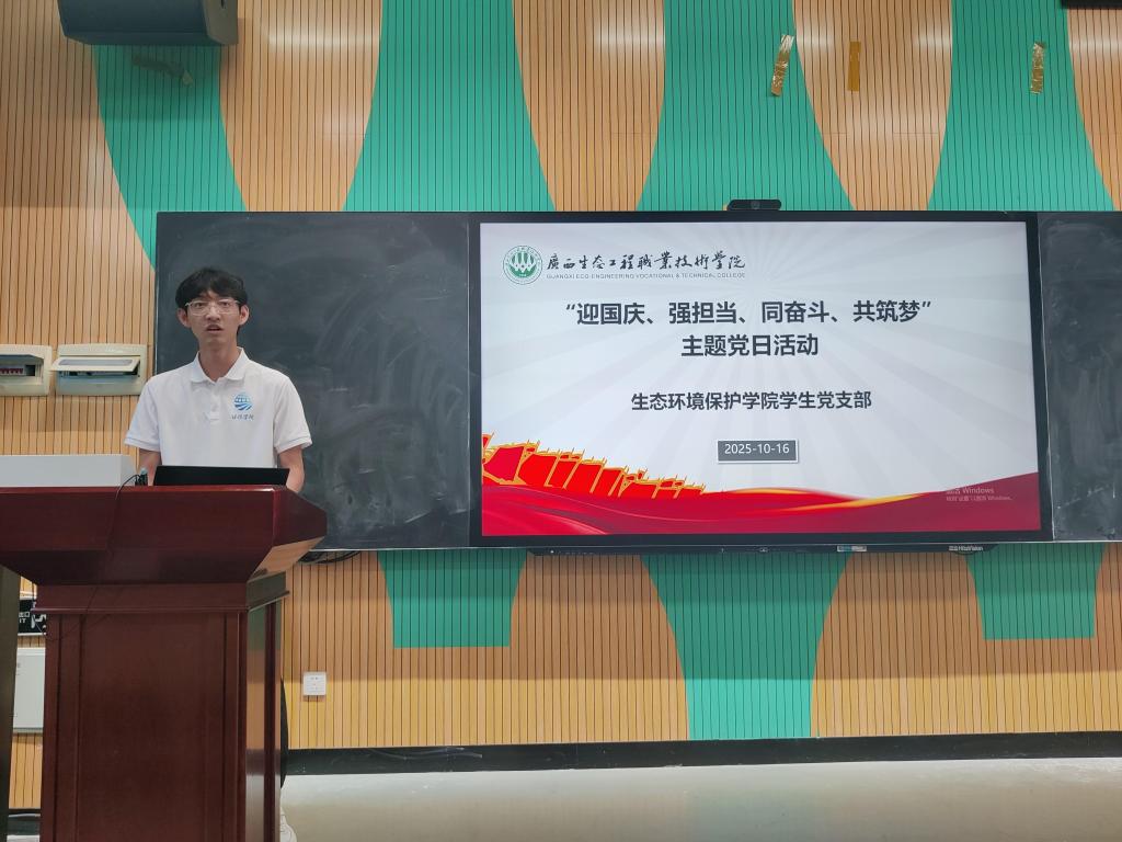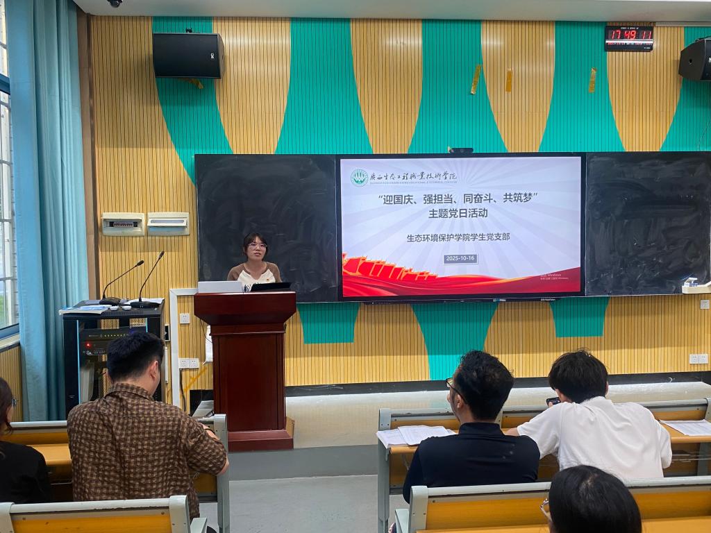 为热烈庆祝中华人民共和国成立,传承红色基因,激发学生党员爱国热情与责任担当,引导青年将个人理想融入国家发展大局,10月16日下午,生态环境保护学院学生党支部在西一1107 教室开展 “迎国庆、强担当、同奋斗、共筑梦” 主题党日活动。学生党支部全体党员及 2025 级新生团员共同参与此次活动。
